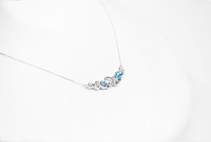 ブライダルリング「Island Blue」から生まれたネックレスブランド「エキューム」。 煌めき揺れる美しい泡をモチーフにしたデザインは胸元を可愛らしく涼やかに演出します。